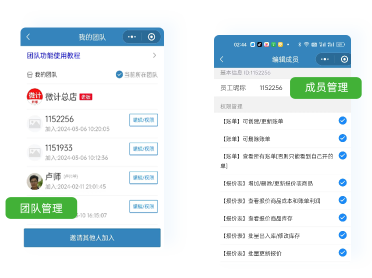 支持创建老板、投资人员、财务、采购、仓管、业务员等不同角色,设置不同业务权限,员工管理更高效。