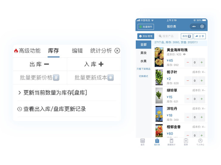 支持出库、入库、按盘点调实时更新库存等实用功能